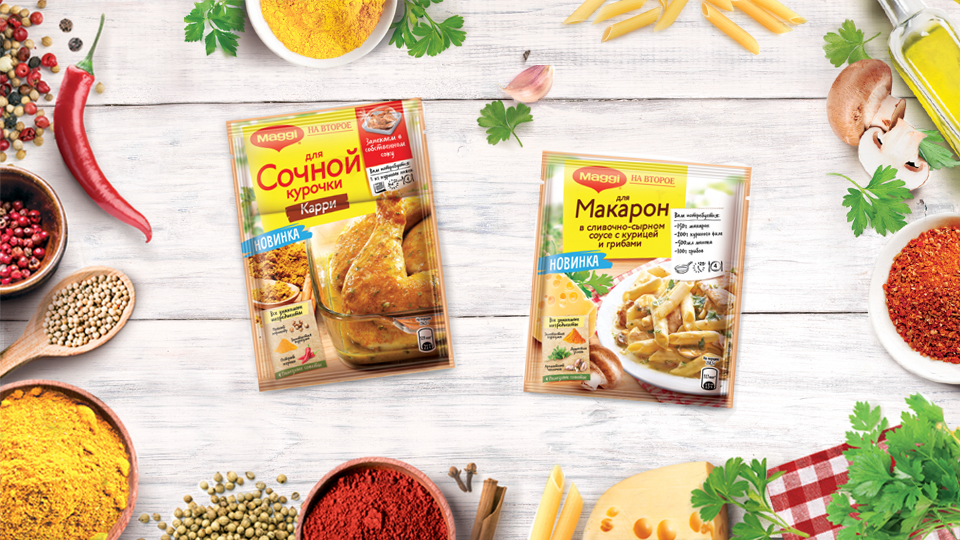 Этим летом «Нестле Россия» представит сразу две вкусные новинки: МАГГИ На Второе Макароны в сливочно-сырном соусе с курицей и грибами и МАГГИ На Второе для Сочной курочки карри.