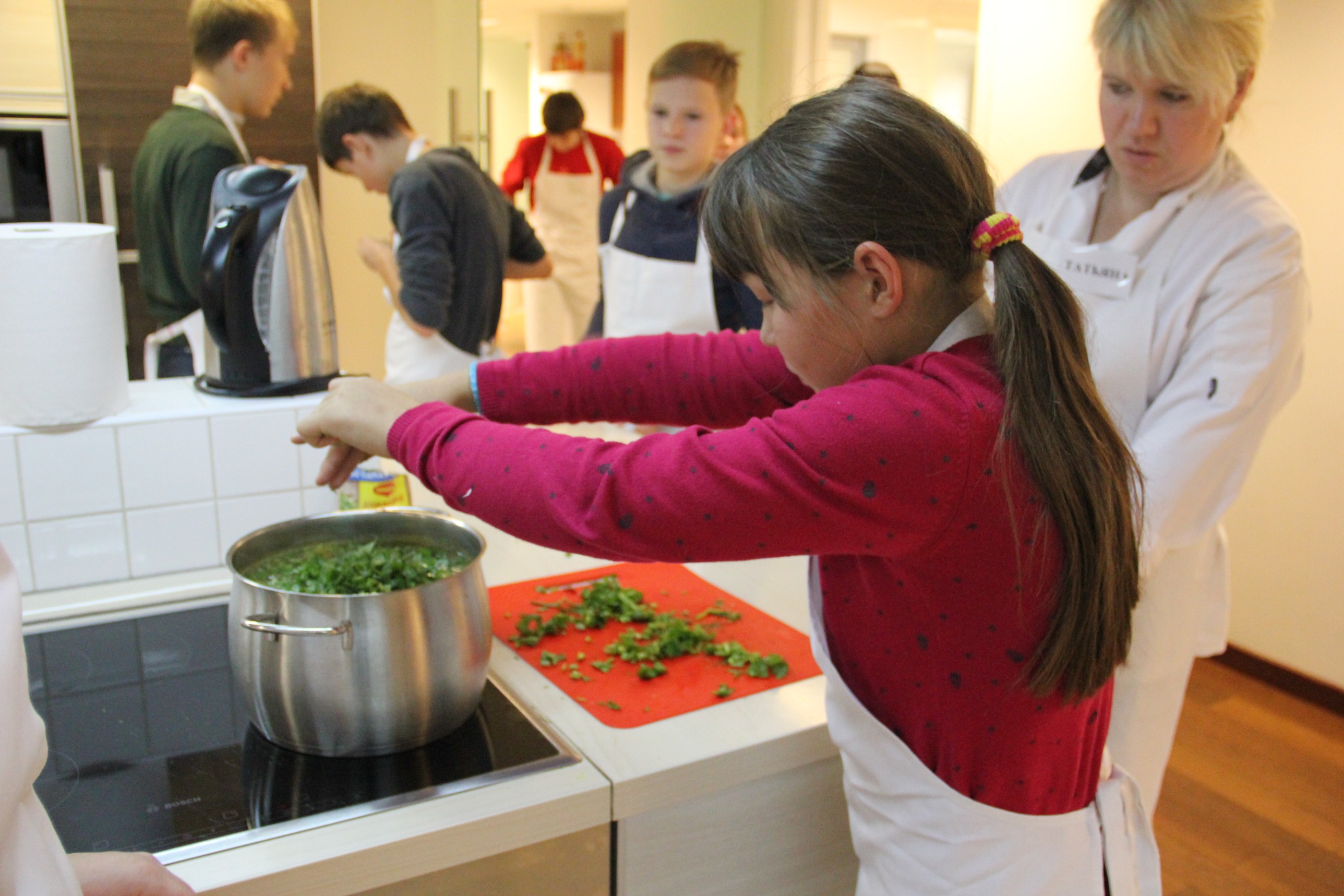 Дети уже бывали в инновационной студии раньше, поэтому сразу вспомнили, что где находится, и смогли без подсказок сопровождающего провести своих преподавателей от лифтов до самой студии. После небольшого инструктажа ребята надели фартуки, распределились на команды, и творческий процесс закипел. По кухне стал разноситься аромат щавеля, который усердно нарезал Дмитрий для кислых щей, тут же запахло свежими овощами, которые Оксана шинковала для салата «Нежность», а из другого угла кухни стал распространяться аромат шоколада… Ребята много общались, подходили друг к другу, предлагали помощь и давали советы, как лучше резать, как держать миксер, как мешать тесто.